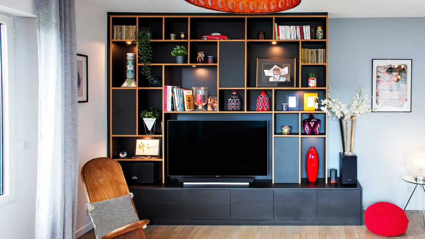 Dans un salon compact, les meubles multifonctions sont vos meilleurs alliés. Intégrer l’écran au sein d’une bibliothèque, par exemple, permet de regrouper livres, objets déco et TV dans un seul ensemble graphique. On privilégie des modèles modulables, dotés de rangements fermés pour dissimuler câbles, box et accessoires, associés à des étagères fines pour exposer quelques pièces décoratives.