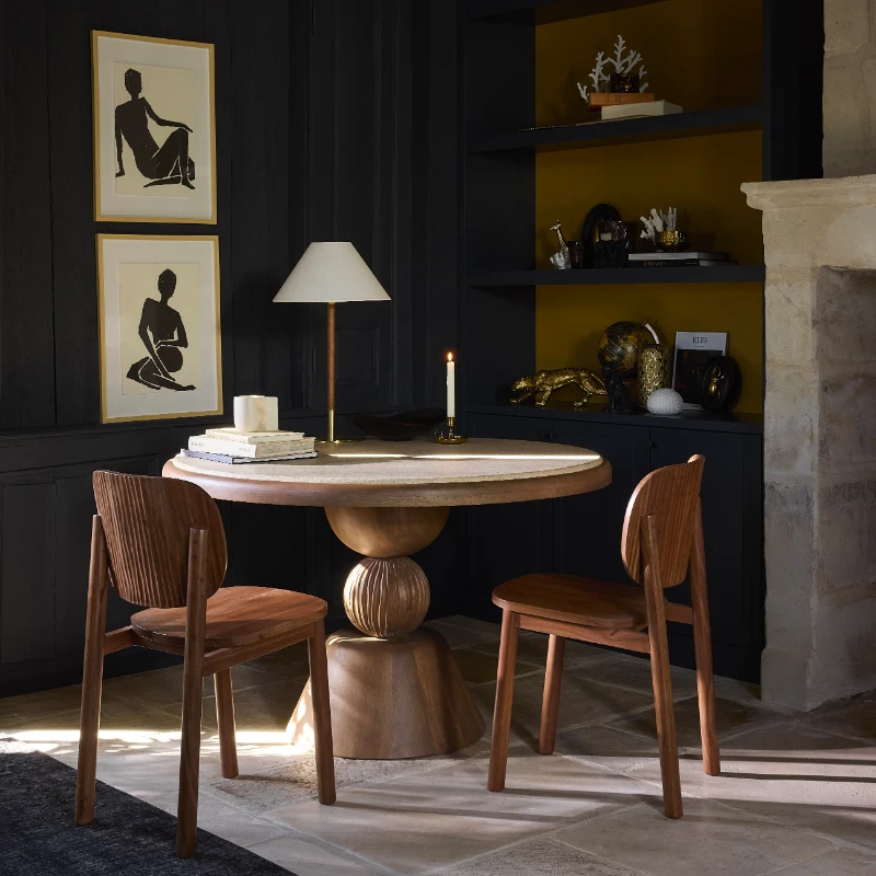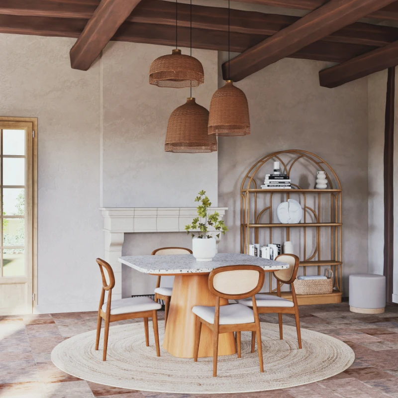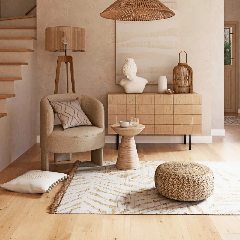 Le buffet en bois blond au design minimaliste, associé à une lampe chrome ultra désirable, capte la lumière et transforme votre espace repas ou salon en un lieu chic et fonctionnel. Les tables basses en bois massif ou effet terrazzo apportent de la modernité et une touche de caractère à chaque pièce.