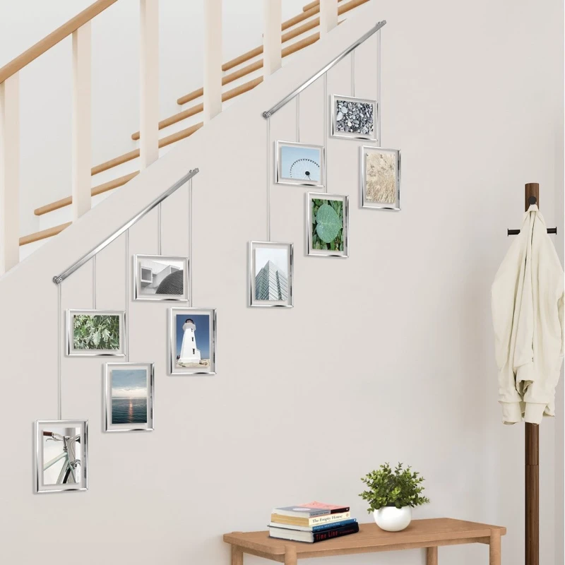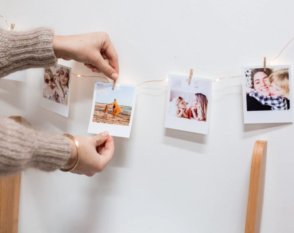 Si vous préférez une version plus simple et bohème, installez un fil le long du mur, et accrochez vos photos à l’aide de petites pinces en bois. Cette présentation rappelle l’esprit des guirlandes lumineuses ou des cordes à linge d’été. Facile à mettre en place, elle permet de changer vos clichés en quelques secondes. C’est une alternative idéale pour les locataires qui ne veulent pas percer les murs.